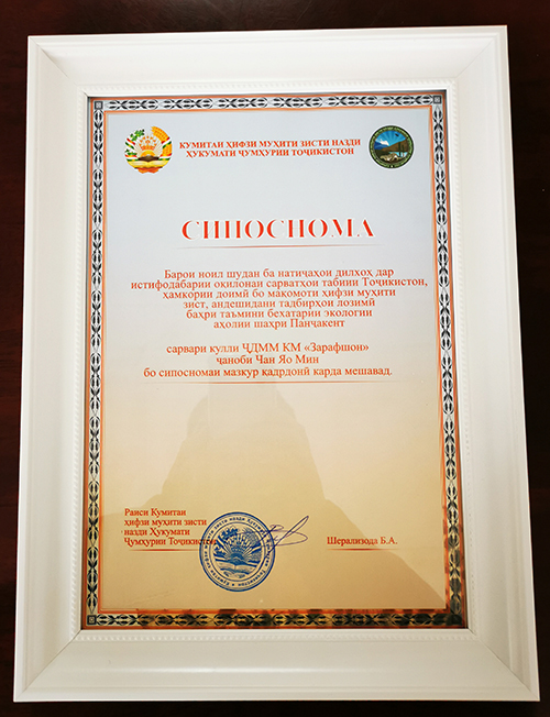本网讯 近日,泽拉夫尚被塔吉克斯坦环保委员会和索格特州政府授予“环境保护优异奖”、“社会经济杰出贡献奖”。
