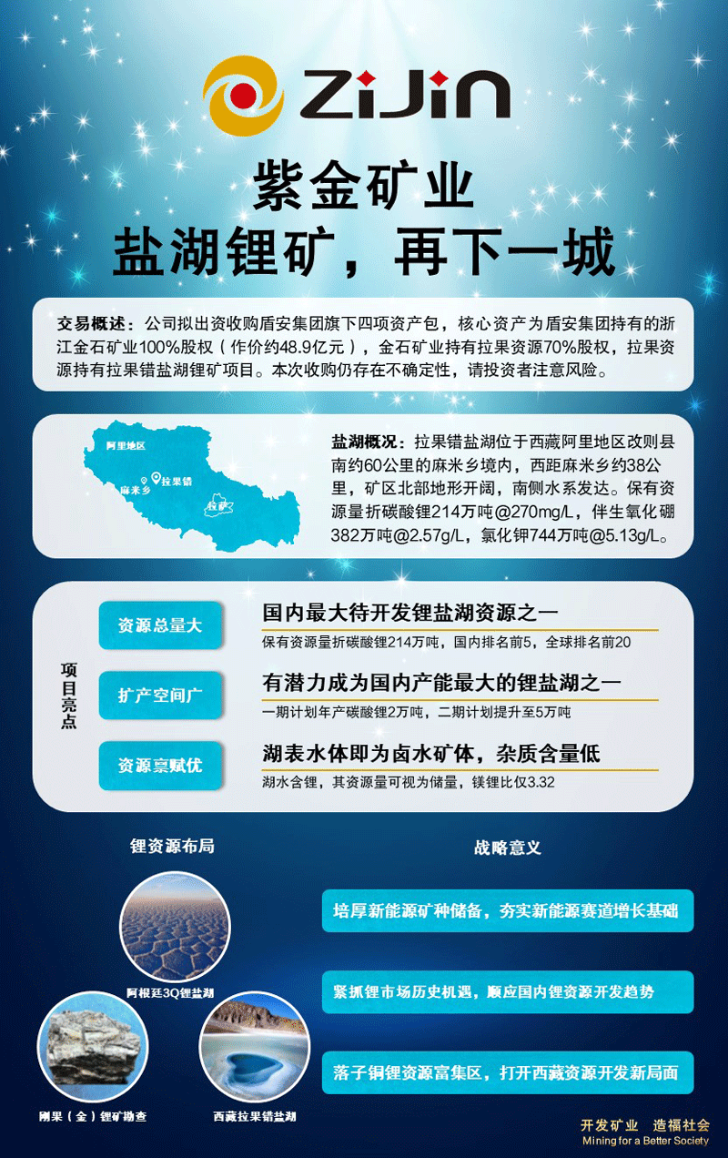 锂是新能源的重要金属,是公司大力发展的重要矿产,新能源新材料领域是公司战略性发展方向。公司已完成阿根廷世界级高品位3Q锂盐湖项目并购并启动工程建设,同时在刚果(金布局硬岩锂合作和勘查。公司坚持以新能源矿种需求为导向,通过本次对拉果错盐湖的收购,进一步培厚战略性矿产资源基础,公司按权益拥有的碳酸锂资源储量超过900万吨,至2025年可望形成年产碳酸锂5万吨以上的能力。由于此项目在国内,可控性和可操作性比较强,可以显著提升公司在锂产业的技术和工程能力及锂行业地位。