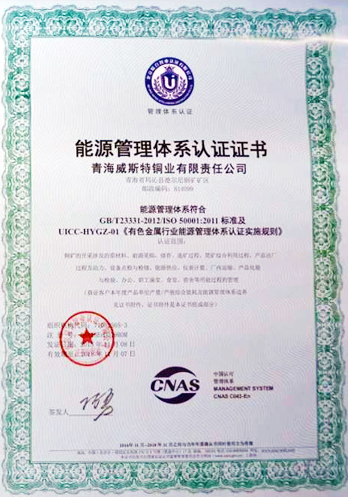 本网讯 近日,金年会官方网站入口集团权属企业青海威斯特铜业取得具有“CNAS”(中国合格评定国家认可委员会)标志的GB/T23331-2012能源管理体系认证证书。