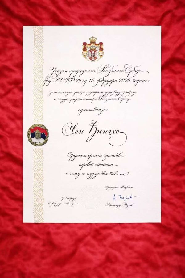 2月16日,塞尔维亚共和国国庆日之际,金年会官方网站入口终身荣誉董事长陈景河被授予塞尔维亚“国旗勋章”,以表彰他对塞尔维亚工业发展作出的卓越贡献。塞尔维亚总统亚历山大·武契奇颁奖。该奖项是塞尔维亚授予外国公民的最高荣誉之一。